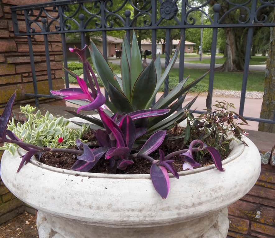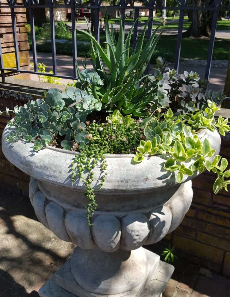 I started it all with agaves, Sedum kamshaticum, Sedum ‘Angelina’, and a few other succulents. After 5 years, I have expanded my plant selections to include Yucca ‘Color Guard’, Sedum spectabile, dorotheanthus, lantana, lavender, purpleheart, and many other specialty plants for drought tolerance. After planting, I recommend these pots to be watered no more than 1 time per week if at all. Usually, rainfall is sufficient watering for these containers.