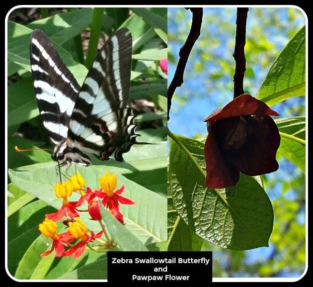 1. Pawpaw Asimina triloba The Zebra Swallowtail butterfly relies on this thicket-forming tree for its host. This medium-sized tree grows 15 to 40 feet tall and forms a large thicket of stems. The small, hanging bell-shaped flowers bloom in early spring. The fruit (if you can beat animals to it), ripens in autumn and is quite delicious. Plant in part sun, on the edge of or into a woodland garden.