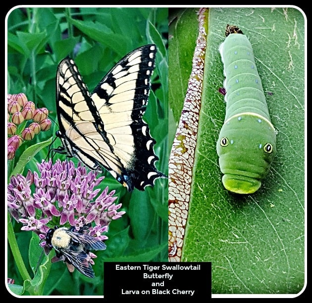 3. Black Cherry Prunus serotina The Eastern Tiger Swallowtail Butterfly larva feeds on this tall, native tree. The wood of this tree is used in furniture across America. It grows 30 to 60 feet tall and 30 feet wide. It has large, panicled flowers in spring that are sweetly fragrant. The edible, black fruit is usually eaten by birds. It is a great tree for full sun to part shade.