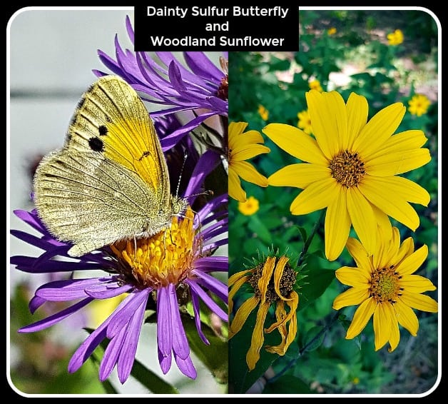 5. Woodland Sunflower Helianthus divaricatus The Dainty Sulfur Butterfly uses this member of the aster family as well as others. The woodland sunflower is a good perennial for naturalizing streambanks or the edge of woodlands. It grows in large colonies, 3 to 4 feet tall. It blooms in late summer.