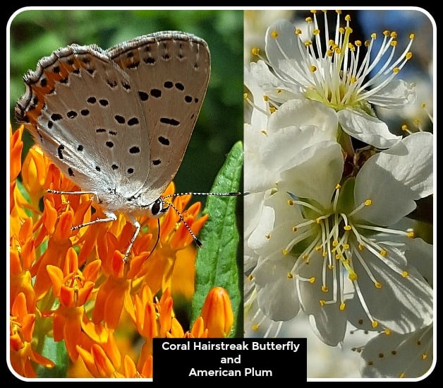 6. American Plum Prunus americana The Coral Hairstreak Butterfly uses this thicket-forming shrub as a host plant. This shrub grows 10 to 15 feet tall and wide. It blooms with white, fragrant flowers in mid Spring. It produces edible plums in late summer that are excellent for jam and jelly, or fresh eating. It grows well in full sun on the edge of the woodland.