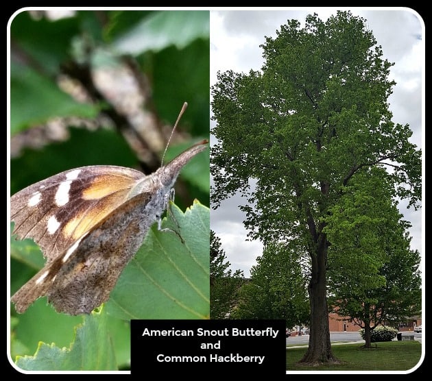 7. Hackberry Celtis occidentalis The American Snout Butterfly is one of several butterflies to use this tree for its larval host. This tree grows 30 to 100 feet tall and 30 to 60 feet wide. It is an excellent shade tree for any yard. It does produce some fruit which is favored by birds.