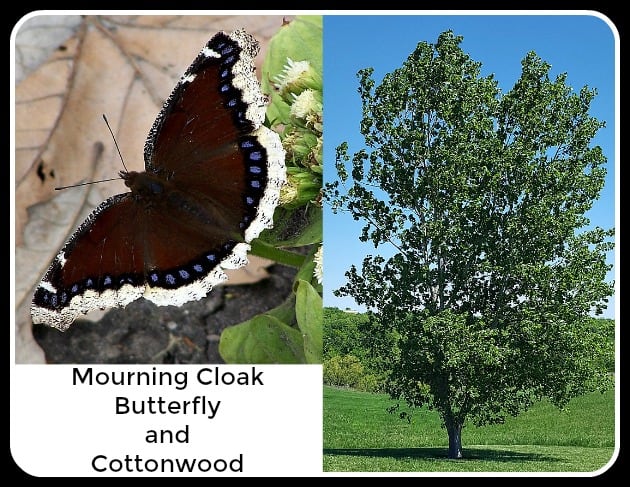 9. Eastern Cottonwood Populus deltoides The Mourning Cloak Butterfly uses the cottonwood and other species for its larval host. This large shade tree grows 60 to 120 feet tall and wide. It has catkin-like flowers in spring. It has excellent fall color (yellow) and is a good tree along streambanks.