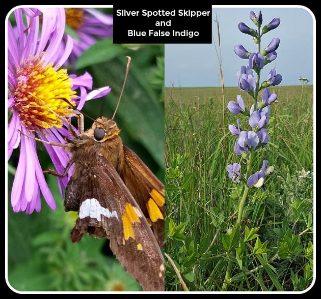 13. Blue False Indigo Baptisia australis The Silver Spotted Skipper uses members of the legume family for its larva. Blue false indigo grows 2 to 4 feet tall and wide, in full sun. It works great in the garden, and is a great cut flower. It blooms in mid Spring.