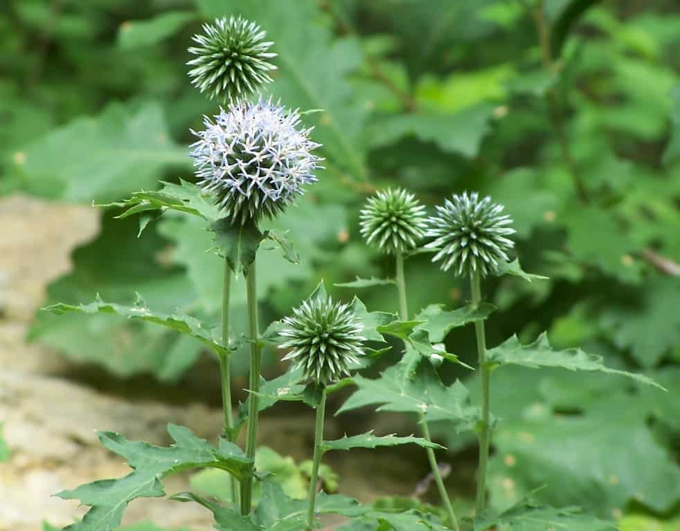 I have mentioned Globe Thistle (Echinops banaticus) as being one of the best perennials from my garden in 2018. Globe thistle, which reigns in the shade garden for its tall, globular blooms, and its spiky foliage, sends forth its blooms in the worst part of summer-July. The blue-gray globes are attractive to many pollinators and make a striking statement in the garden.