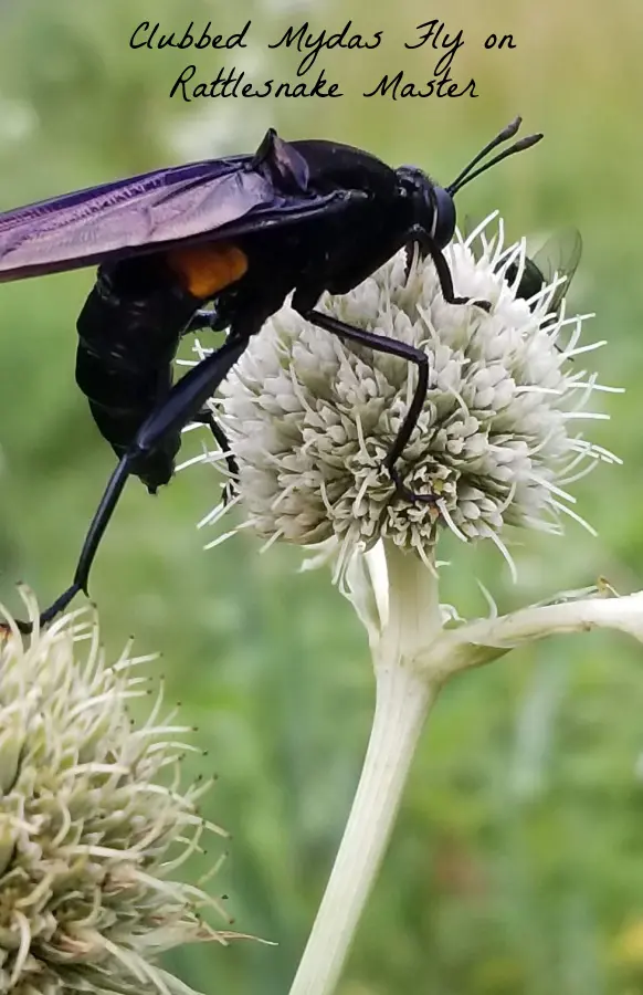 There are only a handful of pests of the rattlesnake master, including the wavy-lined emerald moth, described above, along with some stem-boring moths and beetles. The hollow stems are useful for overwintering mason bees and wasps. Pollinators include a variety of wasps, bees, butterflies, and more. One of the most consistent visitor to my rattlesnake master is the clubbed Mydas fly, which is a predator of scarab wood-feeding beetles. Other pollinators include: