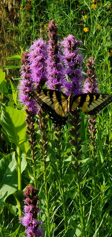 There are few pests, only a couple of moths which feed on the foliage or flowers of prairie blazingstar. One of the more common is the wavy-lined emerald moth, which feeds on flowers and hides by covering itself with cut flower petals. Pollinators include a variety of bees, wasps, beetles, and butterflies, including: