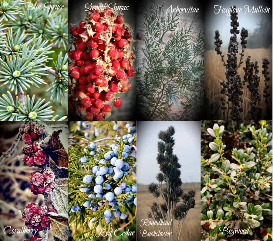These are just some of the materials I like to use. Most are growing either in the nursery or arboretum here at Grimm’s Gardens or in my own backyard. Many times I can forage for the sumac or bushclover in the ditches or at state parks. I also cut and use dried hydrangea blooms, red and gold twig dogwood, willow, crabapple branches, hawthorn branches, teasel, beautyberry, and grasses. I do not typically use holly or winterberry because they do not grow around here naturally. And I never use fake materials.