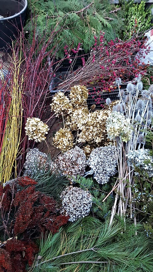 Below is my foraged materials from a few years ago: coralberries from my yard, arborvitae from the nursery, red and yellow twig dogwood branches, painted hydrangea and teasel seedheads. I like to use white pine pinecones wired together and painted red or silver.