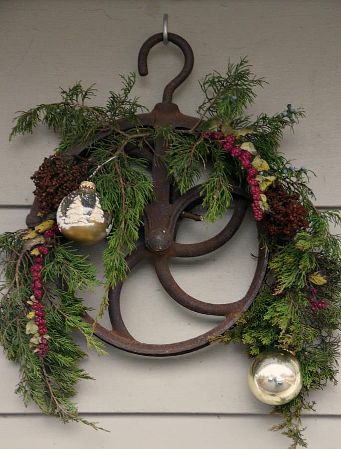 Another thing you can do is decorate objects, such as a wagon, old sled, or this rusty well pulley. It is easy to tuck some greens and berries into these things and add a few bells or ornaments. This was at my house last year.
