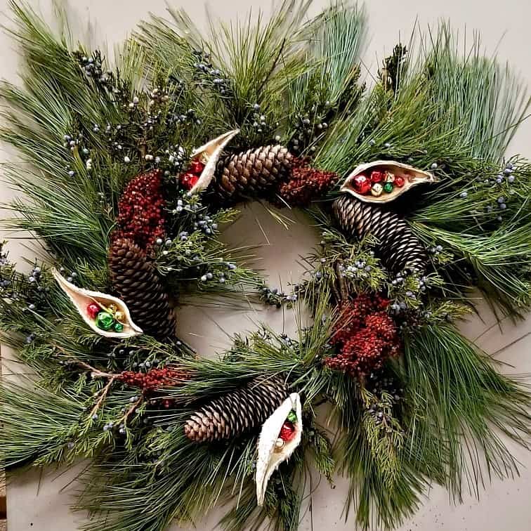I start my wreath making by collecting various greens, wild and cultivated berries, seedpods, and seedheads left over from this season’s growth. I like to mix many greens together with the berries and other materials, then add a homemade bow or cluster of pinecones on the side for impact.