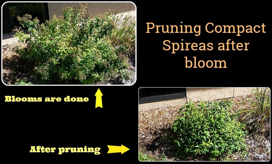 Compact spireas include S. nipponica, S. japonica, S. x bumalda, and S. albiflora. These are commonly referred to as Snowmound, Japanese, Bumald, and Japanese White spireas respectively. These compact spireas bloom on new growth, so they should be cut down in late winter or early spring, to 6-10 inches tall, depending on the size they were previously. You can use hedge trimmers, a trimmer with a stem blade, pruners, or just mow them off if possible. After the old stems are removed, stomp on the plant to break off dead stems, then remove with a rake.