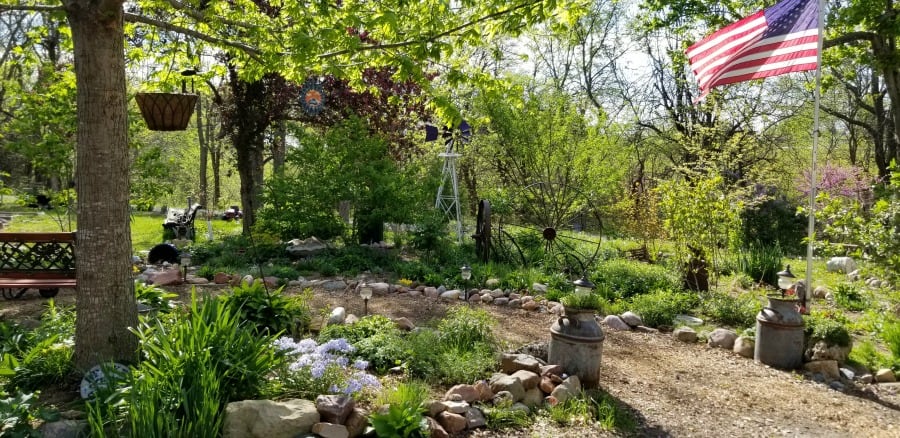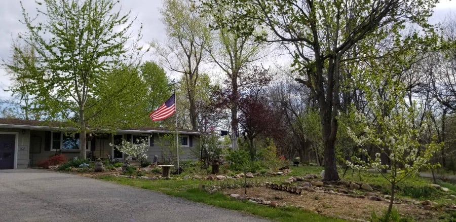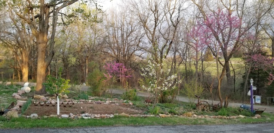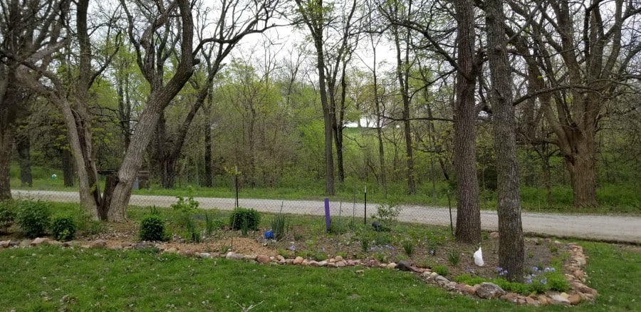 The above photo is my Monarch Waystation and Native plant garden. This is the first garden that you see coming into my driveway. The purple “signpost” is an idea born from too many episodes of M*A*S*H and Winnie the Pooh. The open area that is mulched above was an addition to the garden in 2018 and was planted to tomatoes in June. The white blooming tree is a Sweet Cherry. There is also many redbuds, a sour cherry, and an apricot in this area.