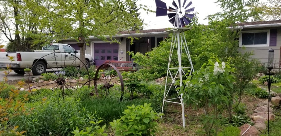 A view of the Entry Garden looking northwest from the peach tree. The mass beside the wagon wheels is ornamental onion ‘Millenium’, which I removed and divided this fall to the sunny side of the house.