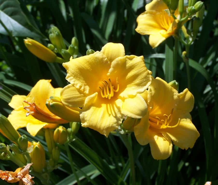 However, there is a lot to be said for daylilies. I now have several varieties in my own garden, however, none are yellow. Daylilies are adaptable. They can grow in a wide range of conditions, from sun to part shade, in well-drained to heavy clay soils. They are drought tolerant. Many are rebloomers. They are pollinator friendly and the flowers and flower buds are edible. I have tried the flower buds and find them to taste like garden peas. There are tall and short ones and can be used in borders, massings, in the back of gardens, and much more!