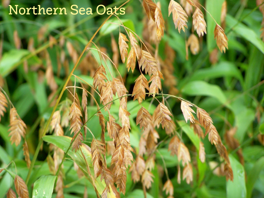 I first came across this native grass when working on gardens in Manhattan, KS. It is a great plant for part shade. Also called wood oats, this woodland plant grows 2 to 3 feet tall and 2 feet wide. It has broad, 3/8 inch wide, gray-green leaves. The flowers and following seedheads are flat, and dance in every breeze. Great for use in ornamental arrangements, or with cut flowers, I plant it sparingly in my native shade borders, because it does self-sow easily and can be weedy. However, if you plant it into an established garden, it will not take over completely.
