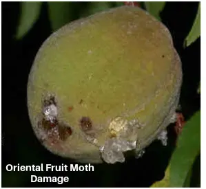 - Oriental Fruit Moth - is an invasive pest from Asia, whose larvae feed not only on the shoots of fruit trees (causing flagging and wilting) but on the fruit causing deformation and gummy sap buildup on the outside. I have seen this damage on peaches in our orchards at Grimm's Gardens. Control is mostly pesticides, but the home gardener can encourage a parasitoid braconid wasp, Macrocentrus ancylivorus, which is a native insect, by planting herbs and flowers around the orchard. The wasp parasitizes the caterpillar.