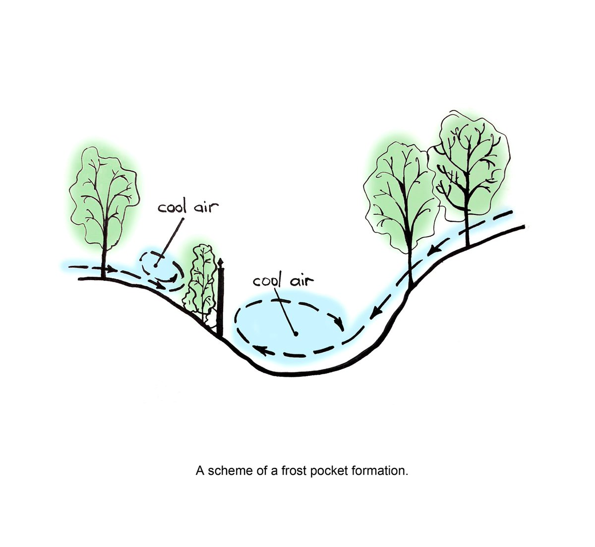Is the spot on a slope, a hill, or down in a valley? - The lay of the land is very important when designing your orchard. If you are down in the valley or a low spot on the side of a hill, then you may be suspect to frost pockets, where a heavy frost can settle and damage flower buds, especially peaches, nectarines, and sweet cherries. It is less of a problem for plums, pie cherries, and pears, which are very cold hardy. Apples are in the middle, some varieties are more cold hardy than others. If you are up on top of a hill, prevailing winds might be a problem, causing leaning trees and branches, or making it difficult for pollinators.