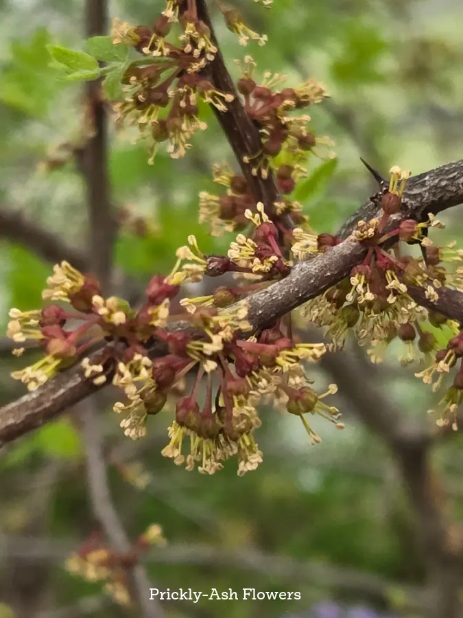 The flowers, though yellow, are insignificant, but are followed by edible (mainly as a spice) red fruits, in small clusters. Fall color is yellow. What makes prickly-ash so special is that it is one of the best plants for hosting the giant swallowtail butterfly.