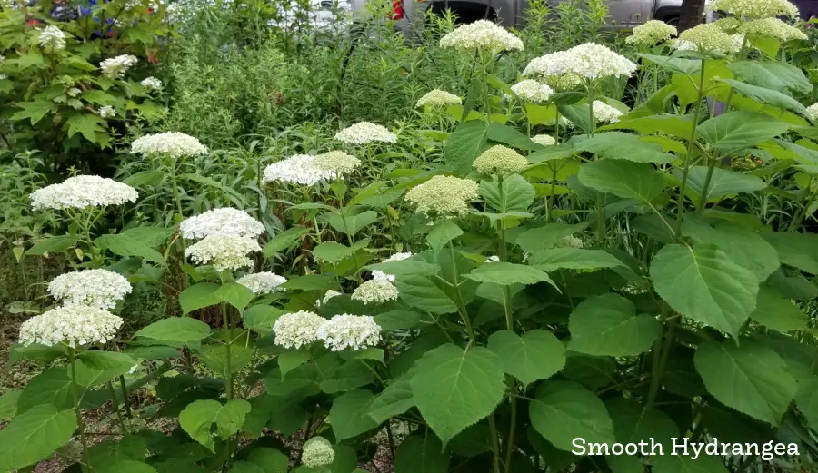 Smooth hydrangea grows 3 to 6 feet tall and can spread over a 10 foot area. It does bloom best if cut down near ground level each season, but you do not have to do that. There are lots of cultivars, but many of them have had the suckering mostly bred out of them. But you cannot go wrong with the straight species, or 'Annabelle'-an older variety which still suckers and spreads, though it typically stays around 3 to 4 feet tall.
