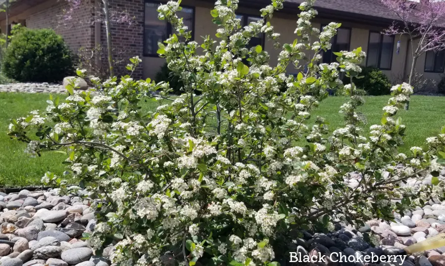 Why is it a 4 season plant? In the spring, black chokeberry starts blooming around mid-April, with pure white, fragrant flowers. The flower buds are slightly pink before they open white. Those flowers attract bees, butterflies, and other early pollinators. After flowering, black chokeberry produces shiny, dark green leaves, and edible blue-black berries. The fall color is shades of red, orange, and rust, depending on how much water and light it gets. And the berries persist into winter if not picked for syrup or jelly. There are a lot of cultivars, and most of them retain some level of suckering.