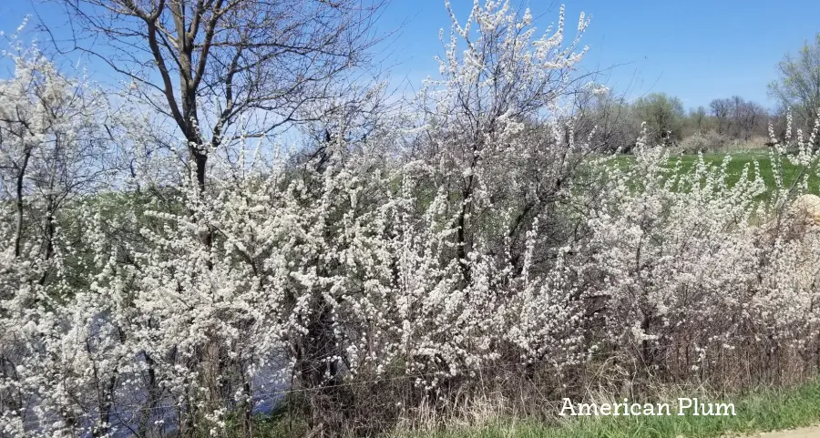 The American plum has always been one of my favorite shrubs. I have memories tied to its blooms, which are very fragrant. When I was a junior in high school, we had prom at the time of its flowering, and I recall putting branches of flowers in my vehicle to keep it well scented. The flowers are white, and bloom profusely in April. However, the plants can grow 10 to 20 feet tall and with suckering can cover a large area. The biggest clump I have found so far was 30 feet deep and 60 feet wide. It is a great place for nesting birds, deer, and other animals.