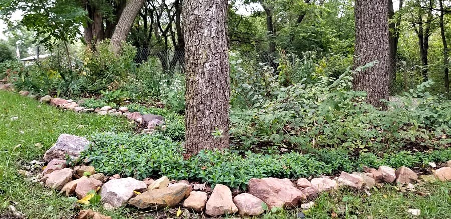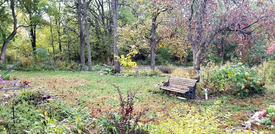 A late October view of the east yard containing the Tea Garden (Lower Left), Walnut Trial Bed (Top Center), Woodland Shade Border (Top Left), and the Shrub Display Bed (Top Right). The Shrub Display Bed starts just behind the bench there with my ‘Prairie Fire’ Crabapple, 1 of 3 Paperbark Maples, ‘Annabelle’ Hydrangea, Chinese Viburnum (un-named), peach tree, and Spicebush (not visible). The Shrub Display Bed then wraps around to the south and east along the driveway. There are currently about 20 different shrubs and trees in this bed including Kentucky Coffeetree, Aromatic Sumac, Nannyberry Viburnum, ‘Emerald Triumph’ Viburnum, Arrowwood Viburnum ‘Blue Muffin’, Mockorange, Serviceberry ‘Regent’, Common white & purple lilacs, Sweetshrub ‘Aphrodite’, Buttonbush, ‘Green Giant’ Arborvitae, and more.
