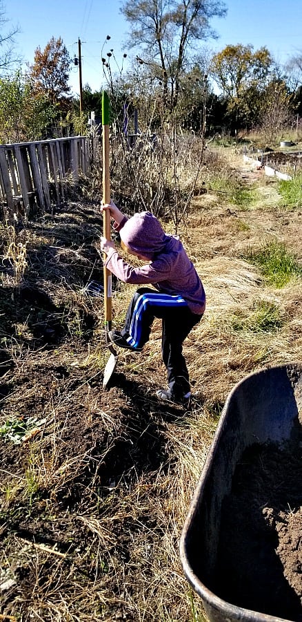 Finally some pics of the Potager Garden (aka the vegetable garden). My 6 year old son always wants to do what I am doing in the garden, so I found the perennial shovel I received last Christmas from my mother-in-law, and he used it to dig soil. I moved this soil here 2 years ago from the garden, piled it and let it compost itself. Now we have been digging it out and moving it to the various raised bed areas around the garden.