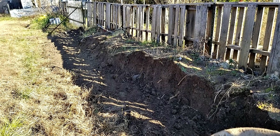 This is the area we dug out the soil from, it will be turned into a walled bed area for vegetables, perennials, and annuals. The pallet fence will degrade over time, but will be replaced with a stone wall and mound to keep out rabbits and other garden critters. We also have a problem with coyotes and wolves coming into the garden to eat pears in the fall.