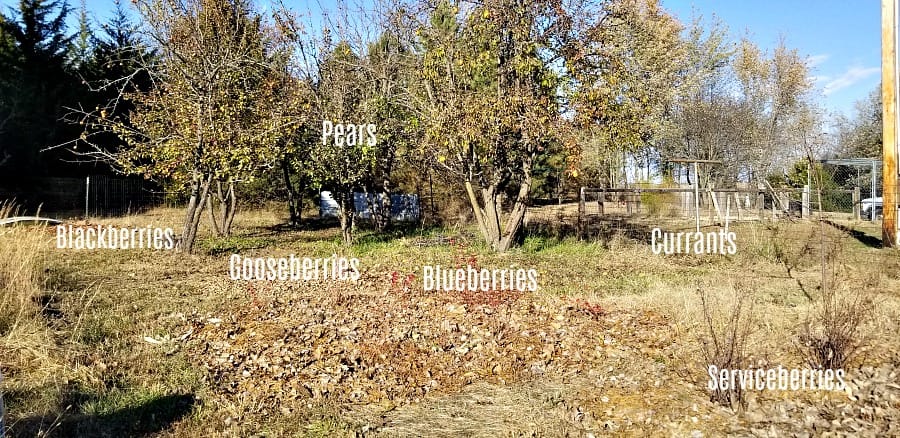 This is the Fruit Patch in the Potager Garden. You can see where different fruits have been planted. I will also be adding raspberries and figs to this area in time, and maybe a few columnar apples. The pear trees are existing, coming with the property.
