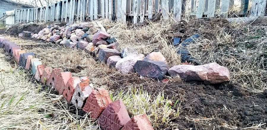Here is a shot of the bed and wall inside the Potager Garden. I will likely add annuals between the stone wall and the pallet fence and put in perennials and vegetables below between the bricks and the wall.