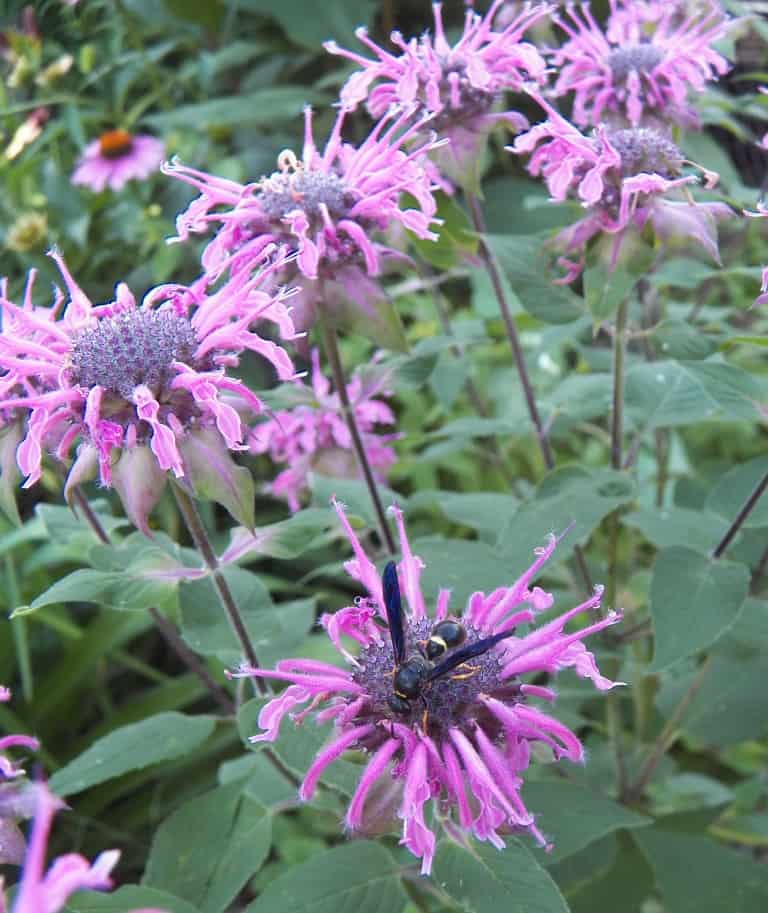 4. Bee Balm (Monarda species) Cultivars: ‘Grand Marshall’ ‘Coral Reef’ ‘Fire Marshall’ ‘Bee You Bee Free’ ‘Dwarf Fireball’ Beebalm is great plant for bumblebees and hummingbirds. This upright perennials blazes into life in the heat of summer with fiery red, pink, mauve, or purple blooms atop minty to lemony smelling stalks. Bee balm prefers moist to well-drained soils in full sun or part shade. While there is no cultivar completely resistant to powdery mildew, I rank this perennial high for its ability to produce pollinator friendly blooms despite disease issues. Cultivars range in size from 2 to 8 feet tall and spread outward via rhizomes in the soil. Blooms from June to September.
