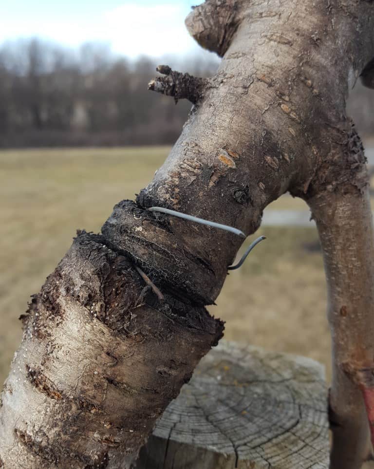 Always remember to take off the wire and stakes used to stake trees! If left too long, the branch will grow against the wire and will be girdled by it, strangling the tree for nutrients and water. This spot can also become an entry point for diseases and insects.