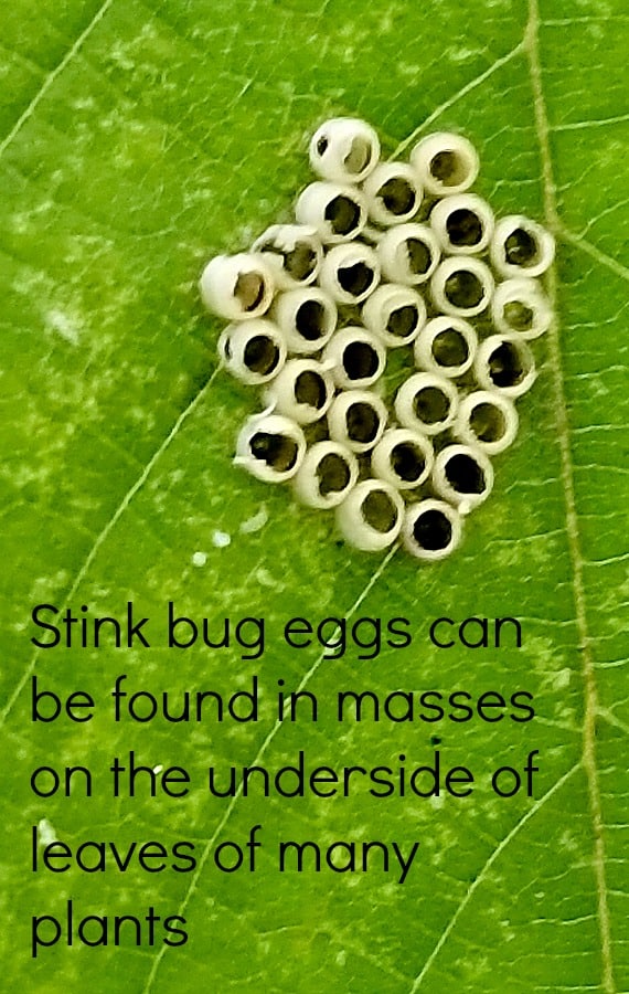 Another thing I saw lots of, especially in midsummer, was stink bug eggs. While many had not hatched yet, I did find a few bunches of recently hatched eggs. Stink bugs lay their eggs in large masses on the underneath side of leaves, on many different kinds of plants. There lots of varieties of stink bugs in our area, that feed on a wide range of plants.