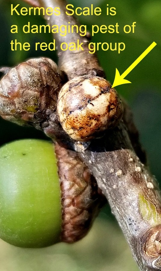 The worst insect offender of the year was introduced to me through the knowledge of our Arborist Nick Haedt. He was able to identify from my description a pest of red oaks – Kermes Scale. This scale insect lives on the outer edges branches of oaks in the red oak group. It is difficult to find on the actual branch, it looks like a little gall. However its size, it causes a lot of damage, starting with flagging of the outer limbs, throughout the tree.